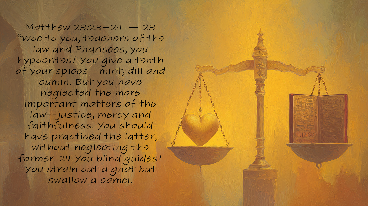 Devotional: Jesus never criticized the Pharisees for caring about the law; He criticized them for missing its heart. They were meticulous about details—counting out even the smallest herbs to make sure their tithes were exact—but blind to the love that weighs more: justice, mercy, and faithfulness. In other words, they measured holiness in teaspoons but ignored the gallons of grace spilling all around them.
