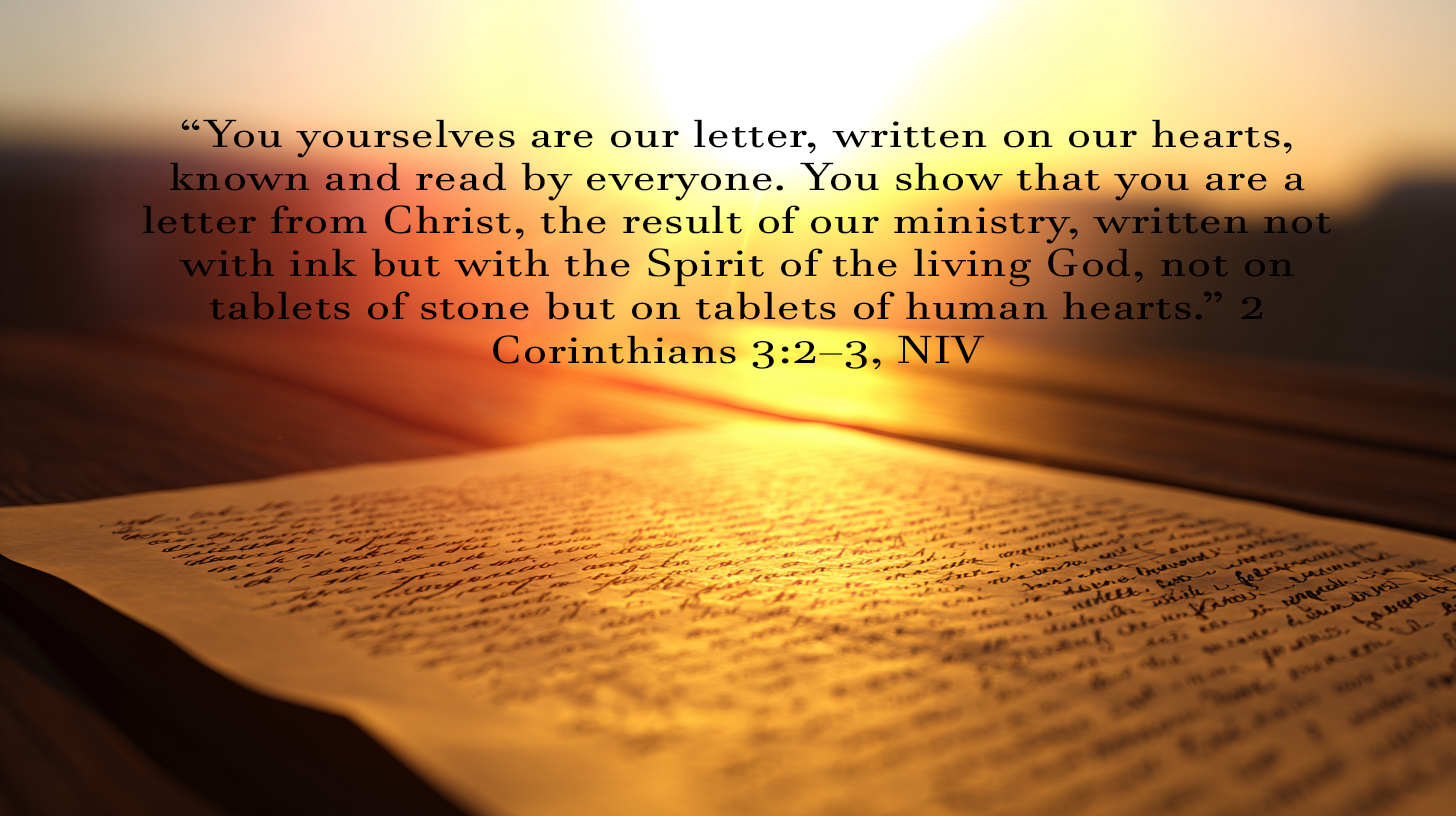 Paul writes to the church at Corinth, “You yourselves are our letter, written on our hearts, known and read by everyone. You show that you are a letter from Christ... written not with ink but with the Spirit of the living God, not on tablets of stone but on tablets of human hearts.”