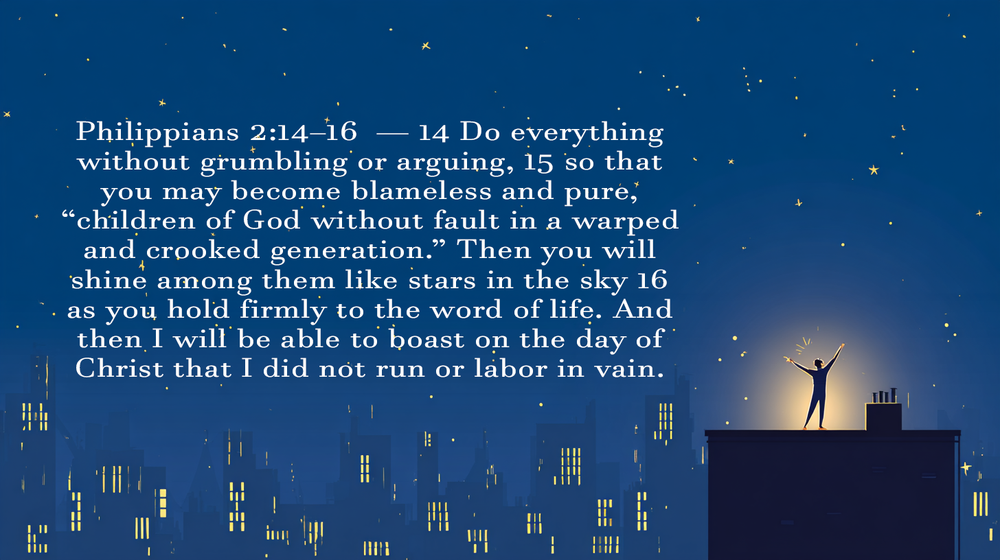 Paul encourages believers to “do everything without grumbling or arguing, so that you may become blameless and pure, ‘children of God without fault in a warped and crooked generation.’ Then you will shine among them like stars in the sky as you hold firmly to the word of life.”